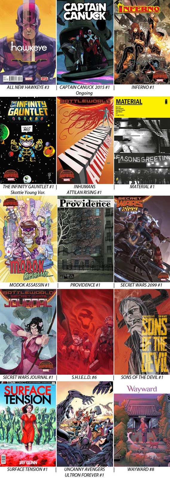 | ADVENTURE TIME #40 ADVENTURE TIME #40 SUBSCRIPTION DAWSON VAR ALL NEW HAWKEYE #3 BIG TROUBLE IN LITTLE CHINA #11 CAPTAIN CANUCK 2015 ONGOING #1 DEADLY CLASS #13 GOD IS DEAD #36 END OF DAYS CVR GRINDHOUSE DRIVE IN BLEED OUT #5 (OF 8) INFERNO #1 SWA INFINITE LOOP #2 (OF 6) INFINITY GAUNTLET #1 YOUNG VAR SWA INHUMANS ATTILAN RISING #1 SWA INJUSTICE GODS AMONG US YEAR FOUR #2 IRON FIST LIVING WEAPON #12 JUDGE DREDD #30 MATERIAL #1 MODOK ASSASSIN #1 (OF 5) SWA PISCES #2 PROVIDENCE #1 (OF 12) DREAMSCAPE WRAP CVR PROVIDENCE #1 (OF 12) PANTHEON CVR PROVIDENCE #1 (OF 12) REGULAR CVR SANDMAN OVERTURE #5 (OF 6) CVR B SECRET WARS 2099 #1 (OF 5) SWA SECRET WARS JOURNAL #1 (OF 5) SWA SHIELD #6 SONS OF THE DEVIL #1 CVR A INFANTE SONS OF THE DEVIL #1 CVR B MANAPUL SONS OF THE DEVIL #1 CVR C RIVERA SUICIDERS #4 SURFACE TENSION #1 (OF 5) REG GUNN TMNT ONGOING #46 TOMB RAIDER #16 UBER #25 WRAP CVR UNCANNY AVENGERS ULTRON FOREVER #1 WAYWARD #8 CVR A CUMMINGS & BONVILLAIN WAYWARD #8 CVR B NIIMURA |